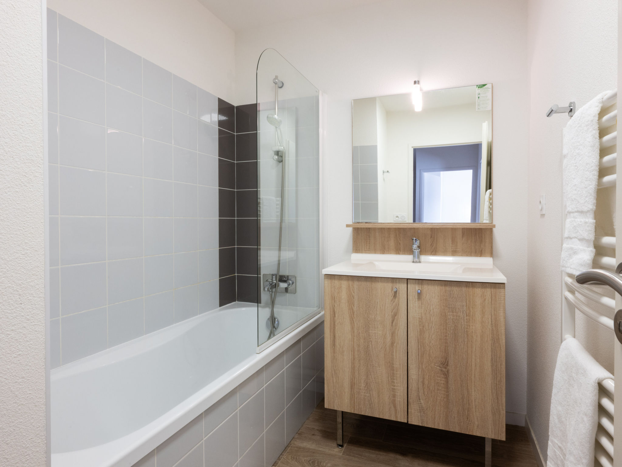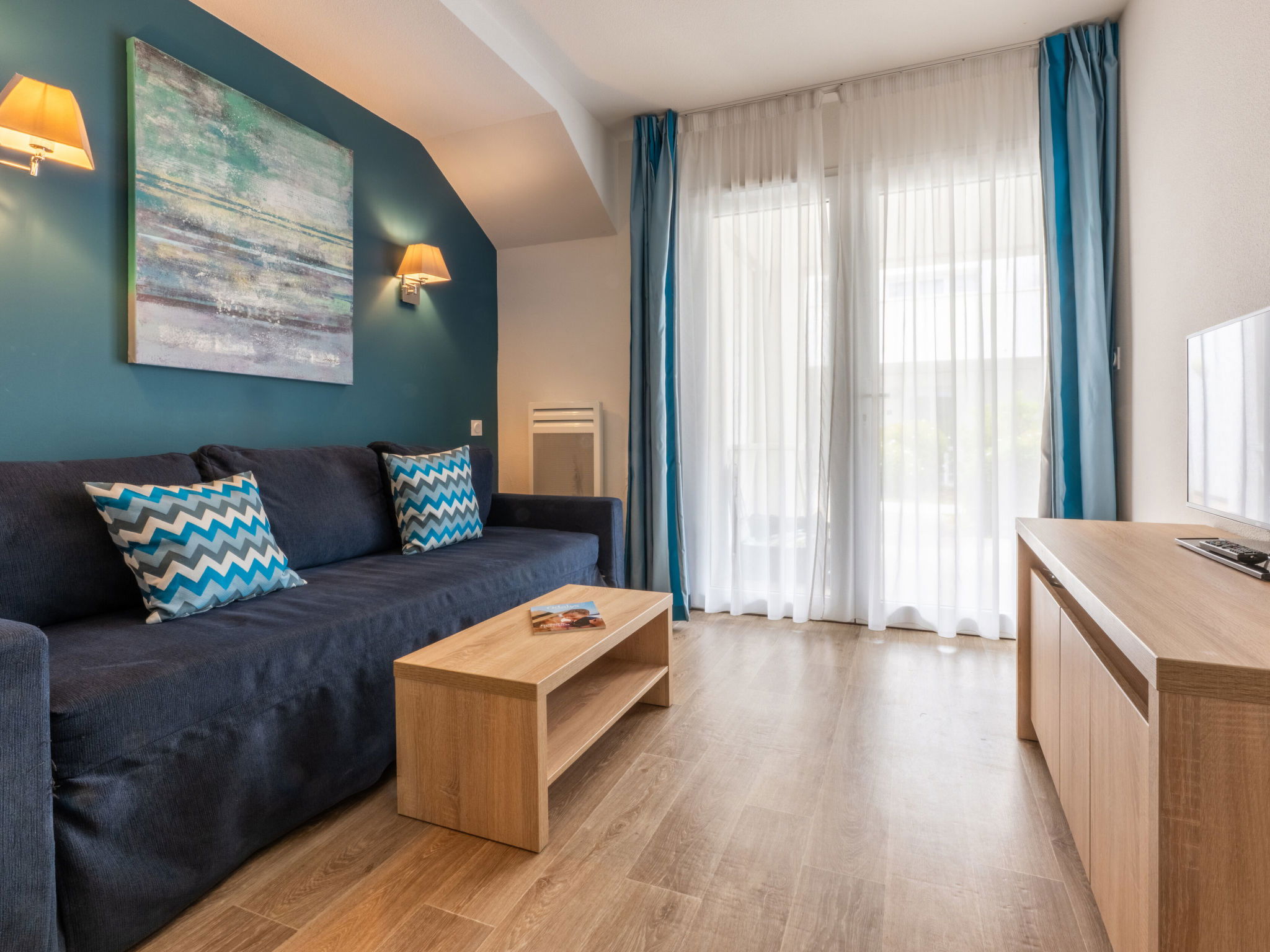 " Odalys Collection Le Domaine des Pins", 1-room studio 22 m2, on the ground floor. Modern furnishings: living/sleeping room with 1 double sofabed, dining table and satellite TV (flat screen). Exit to the terrace. Small, open kitchen (dishwasher, 2 ceramic glass hob hotplates, toaster, kettle, electric coffee machine, combination microwave). Bath/WC. Electric heating. Terrace. Terrace furniture. Facilities: children's high chair, baby cot, hair dryer. Internet (WiFi, free). Please note: non-smokers only. Maximum 2 pets/ dogs allowed. Smoke alarm, fire extinguisher.