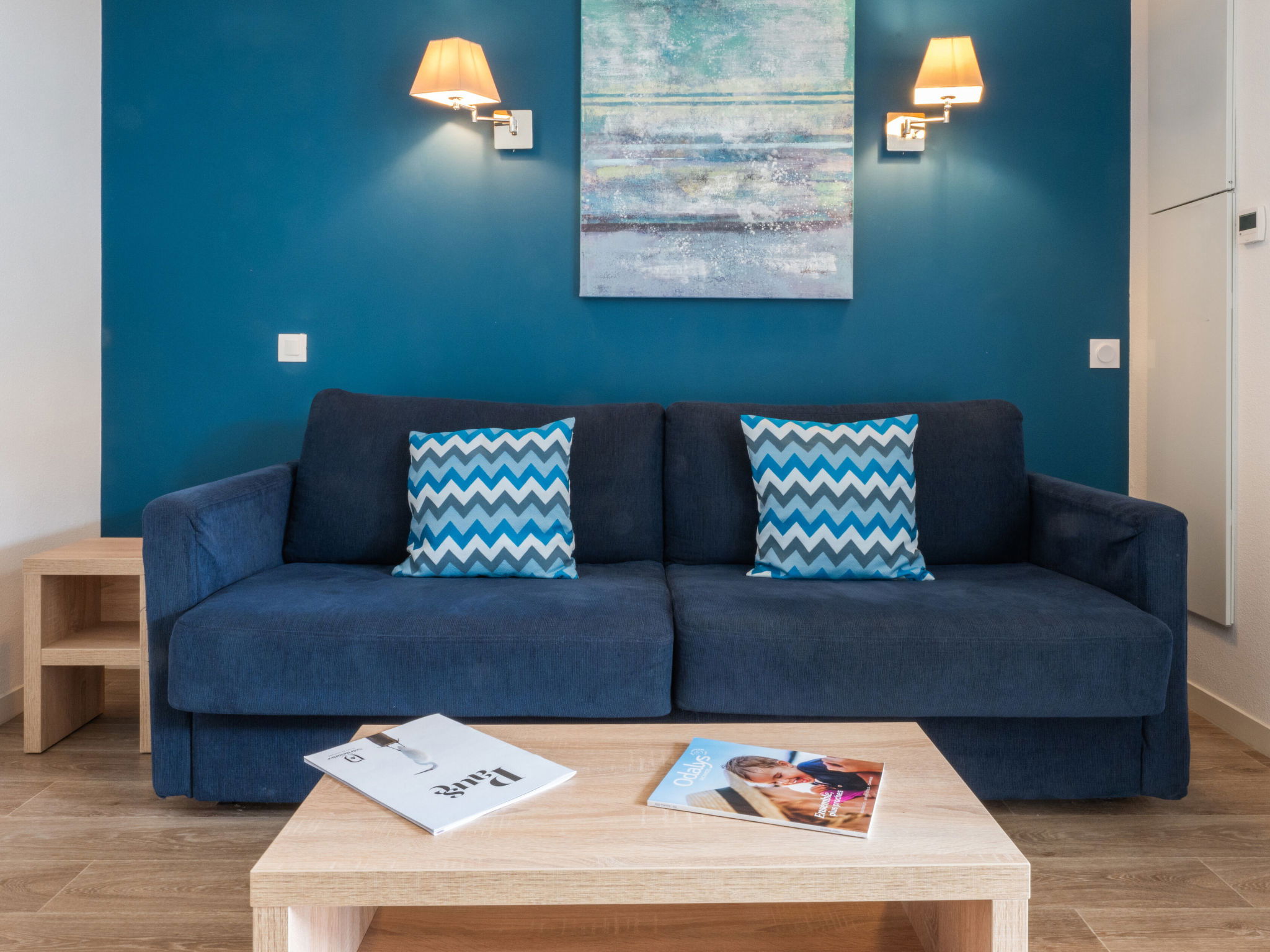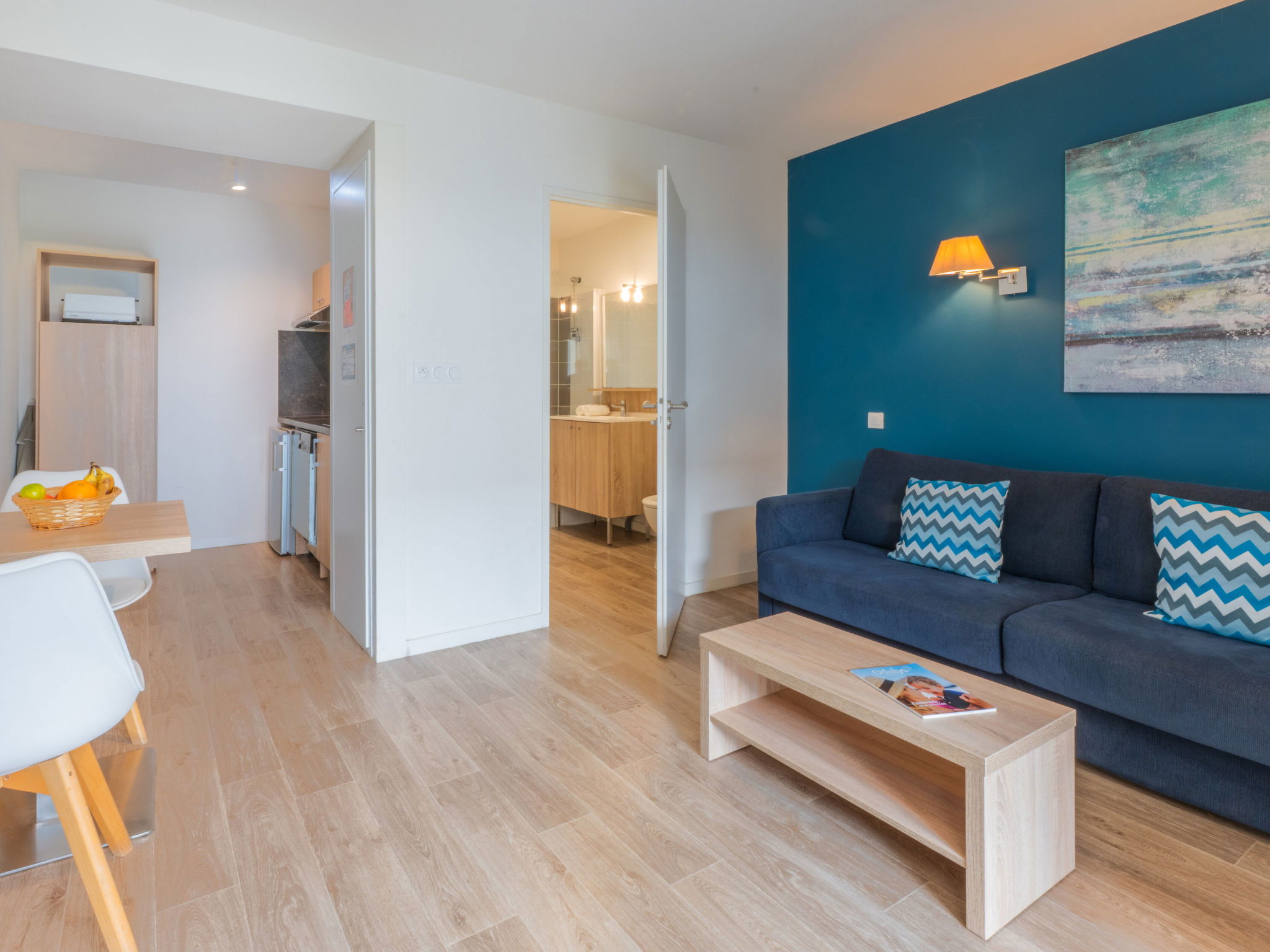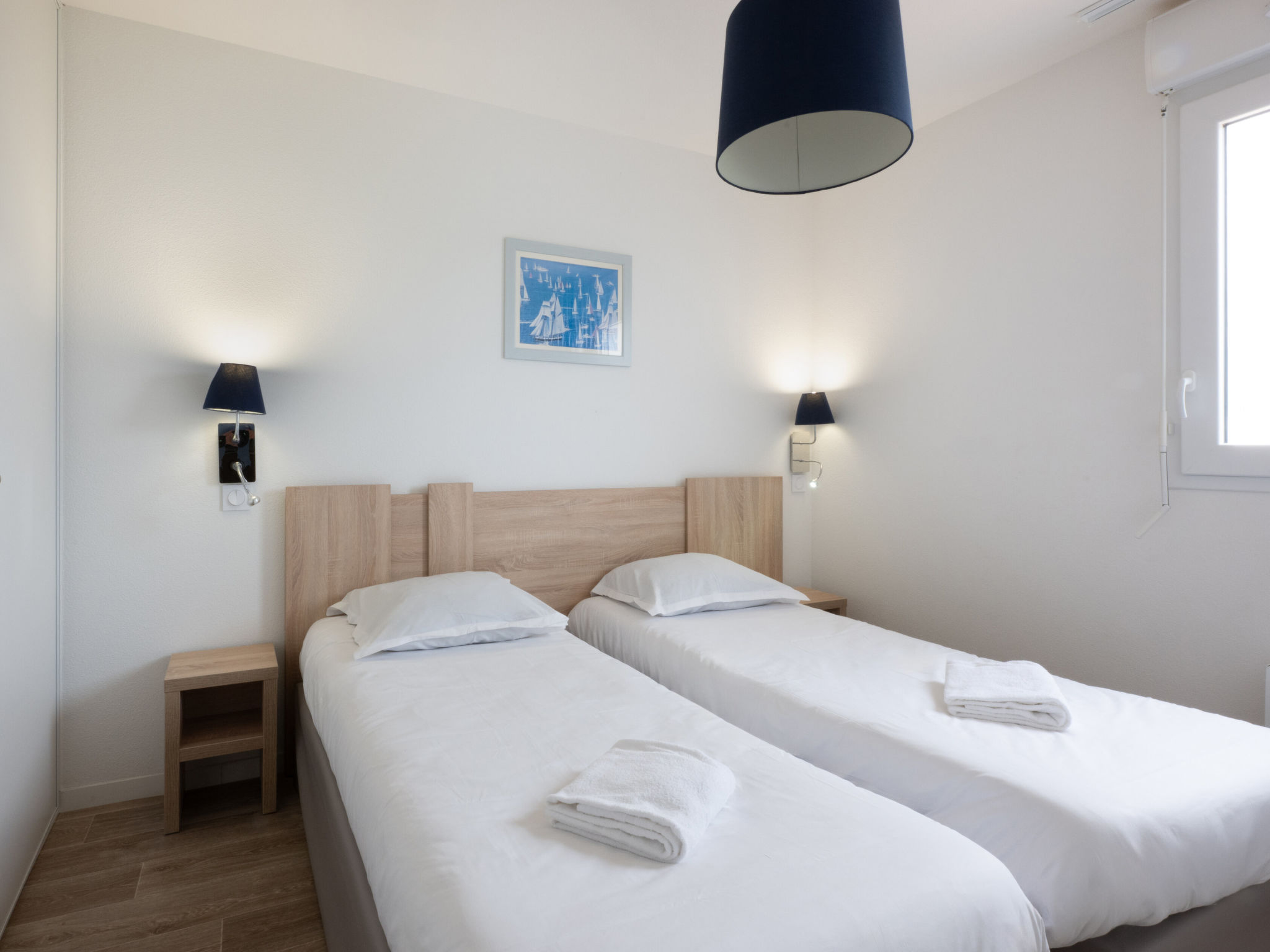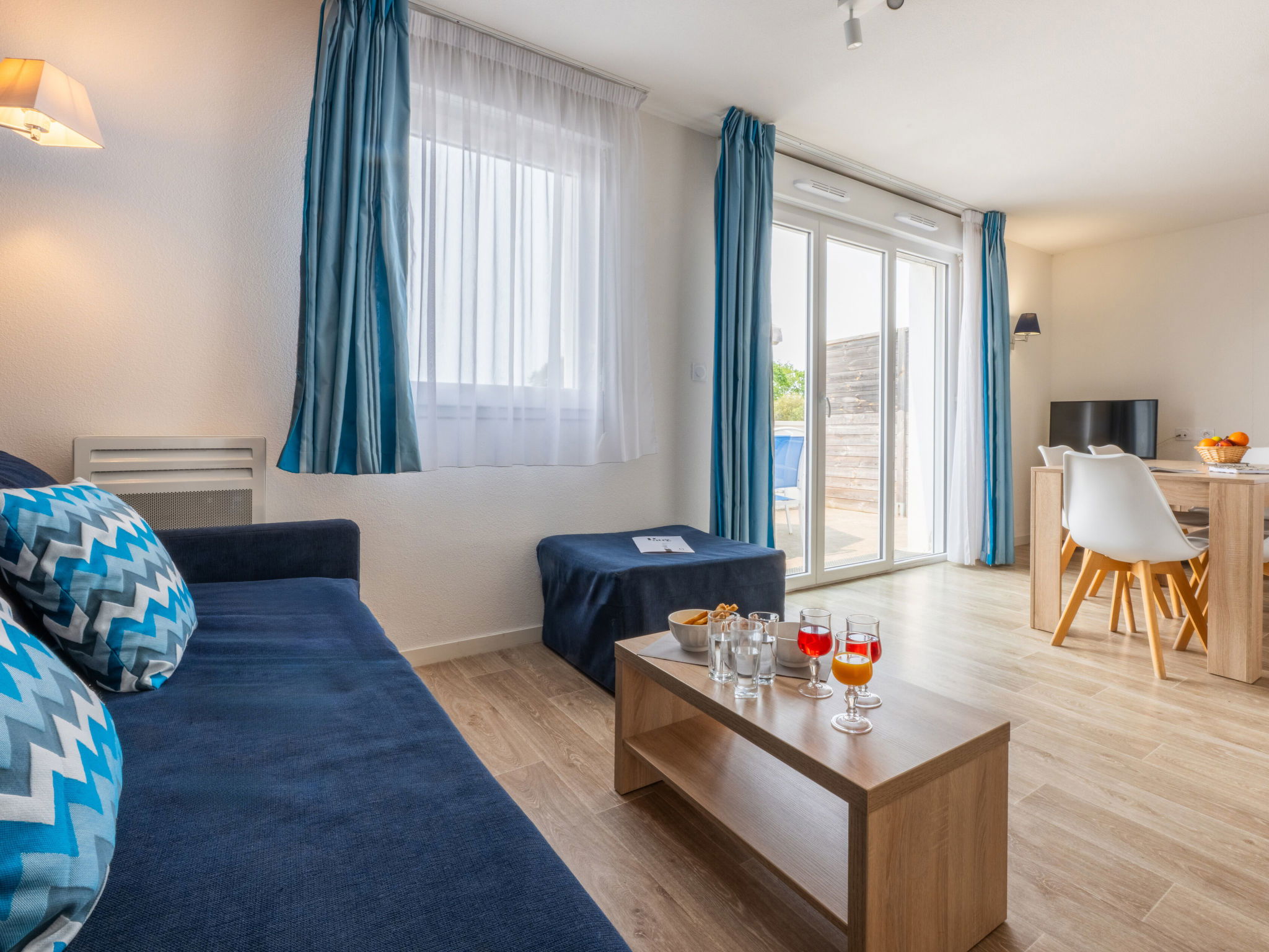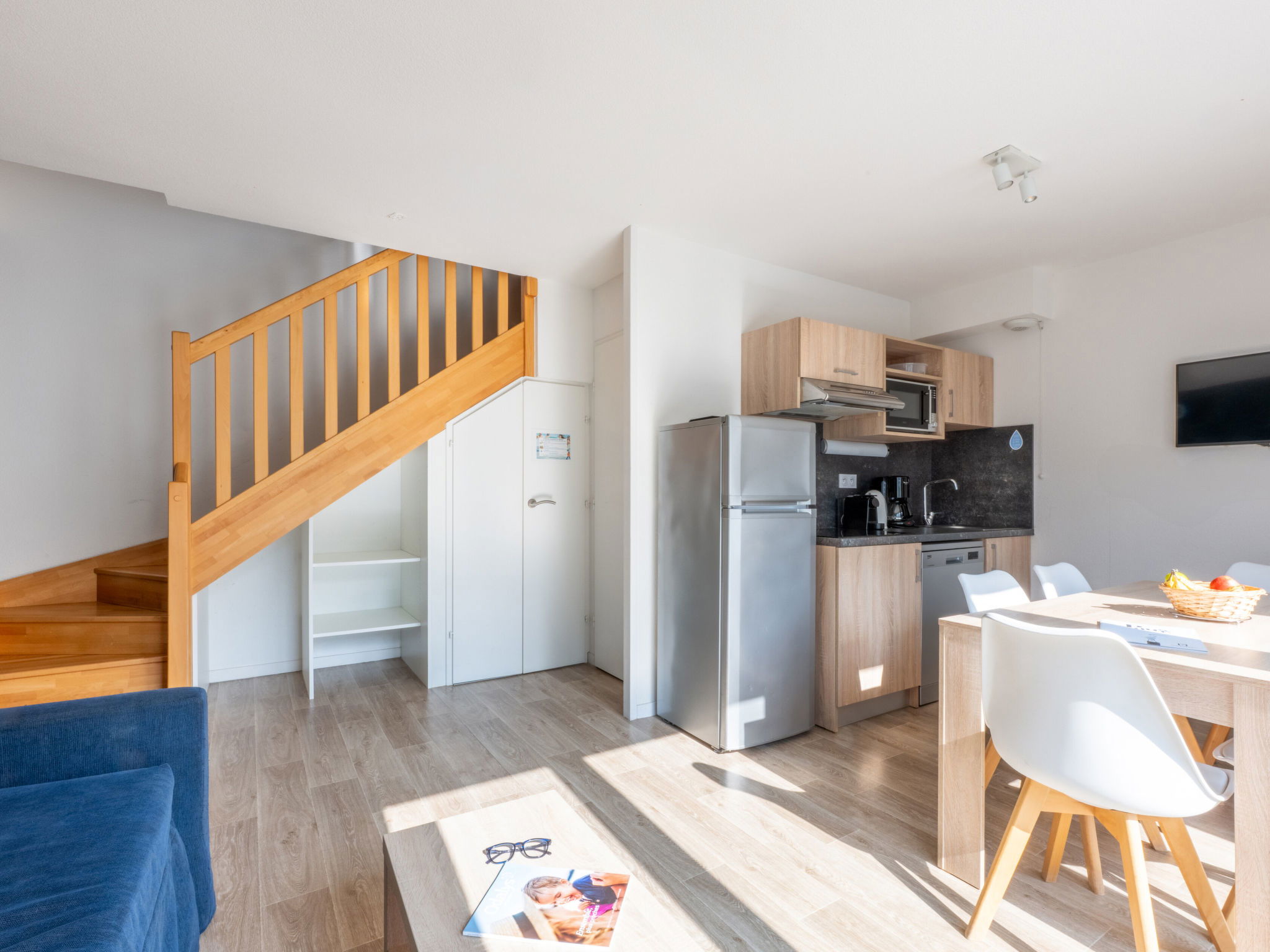 " Odalys Collection Le Domaine des Pins", 3-room apartment 44 m2 on 2 levels. Modern furnishings: living/sleeping room with 1 double sofabed, dining table and satellite TV (flat screen). Open kitchen (dishwasher, 4 ceramic glass hob hotplates, toaster, kettle, electric coffee machine, combination microwave). Upper floor: 1 double bedroom. 1 room with 2 sleeping facilities. Bathroom, sep. WC. Electric heating. Balcony or terrace. Balcony furniture. Facilities: children's high chair, baby cot, hair dryer. Internet (WiFi, free). Parking. Please note: non-smokers only. Maximum 2 pets/ dogs allowed. Smoke alarm, fire extinguisher.