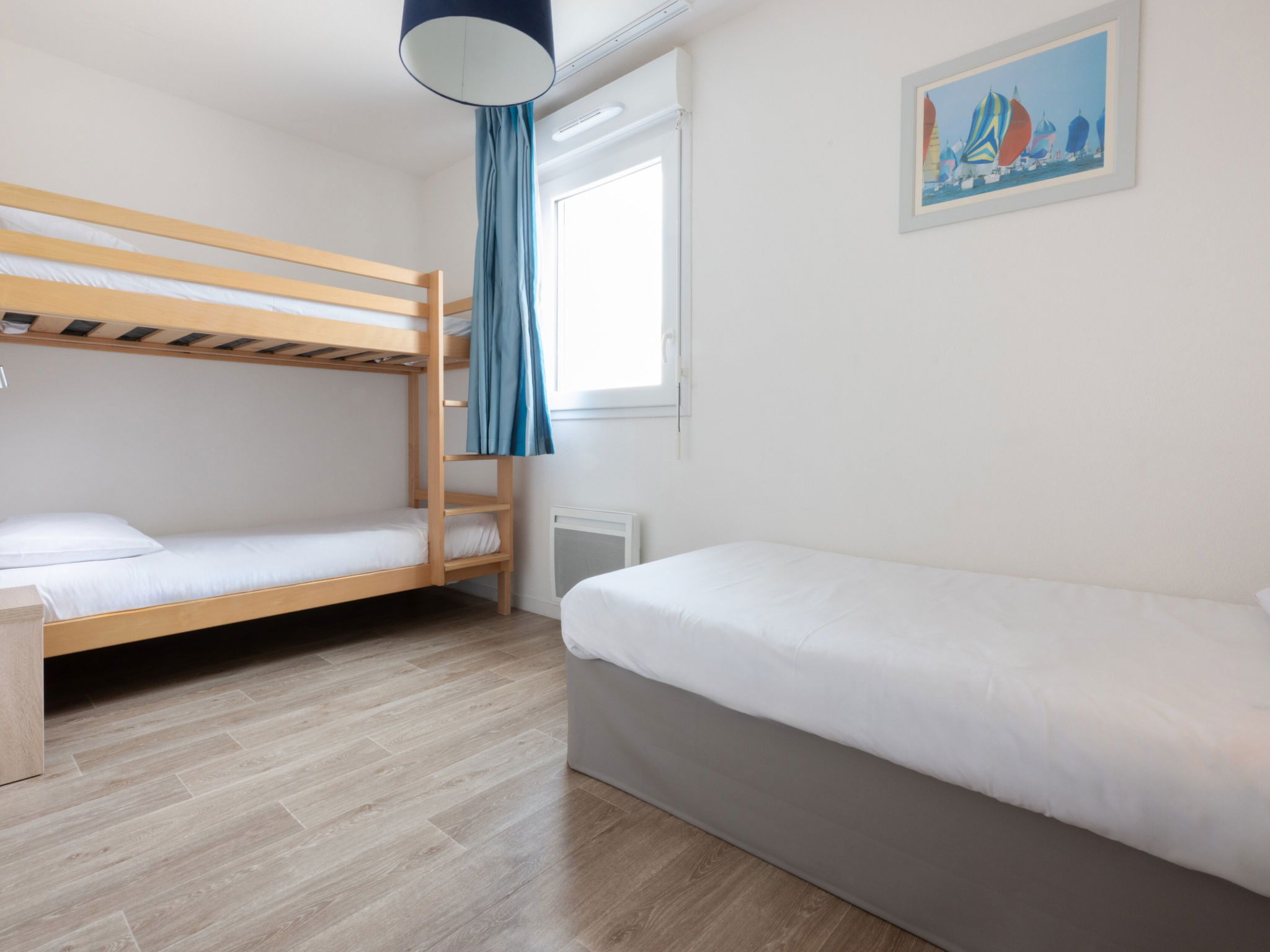 Resort "Le Domaine des Pins", 3 storeys, built in 2016. 87 apartments in the residence. 1.5 km from the centre of Noirmoutier, 44 km from the centre of Challans, 91 km from the centre of Nantes, 400 m from the sea, 700 m from the beach. For shared use: property 10'000 m2 (fenced), indoor pool heated, fenced (15 x 8 m, depth 145 - 155 cm, seasonal availability: 15.Apr. - 31.Oct.) with internal staircase. Children's pool, children's playground. In the complex: reception, fitness room, steam room (extra). Table tennis, washing machine, tumble dryer (for shared use, extra). Parking. Shop 1.5 km, bus stop " Noirmoutier - Gare Routière" 1.9 km, sandy beach 400 m. Nearby attractions: Ecoles de voile au Fort St Pierre, Sports de glisse (paddle, char à voile), Pêche à pied tout autour de l’ile, Pistes cyclables (80 km de piste), Randonnées. Please note: the photograph shows a typical example. The holiday properties may differ in living space, floorplan, equipment and furnishing.