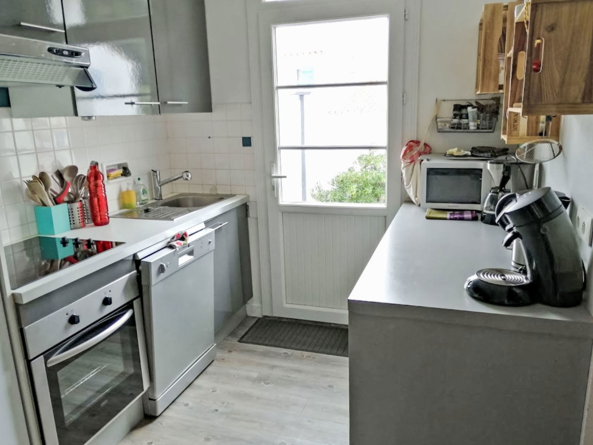 3-room house 70 m2. Renovated, beautiful furnishings: living/dining room with dining table and TV (flat screen). Exit to the garden. 1 room with 1 french bed (140 cm, length 190 cm). 1 room with 3 beds (80 cm, length 190 cm). Open kitchen (oven, dishwasher, 4 ceramic glass hob hotplates, toaster, kettle, microwave, electric coffee machine). Exit to the terrace. Shower, sep. WC. Electric heating. Terrace partly roofed, south facing position. Terrace furniture, electric barbecue (portable), deck chairs (2). Facilities: washing machine, children's high chair, baby cot. Internet (WiFi, free). Parking. Please note: non-smoking house. Maximum 1 pet/ dog allowed. Smoke alarm. Offer by a private individual according to  Art. 155, IV of CGI.