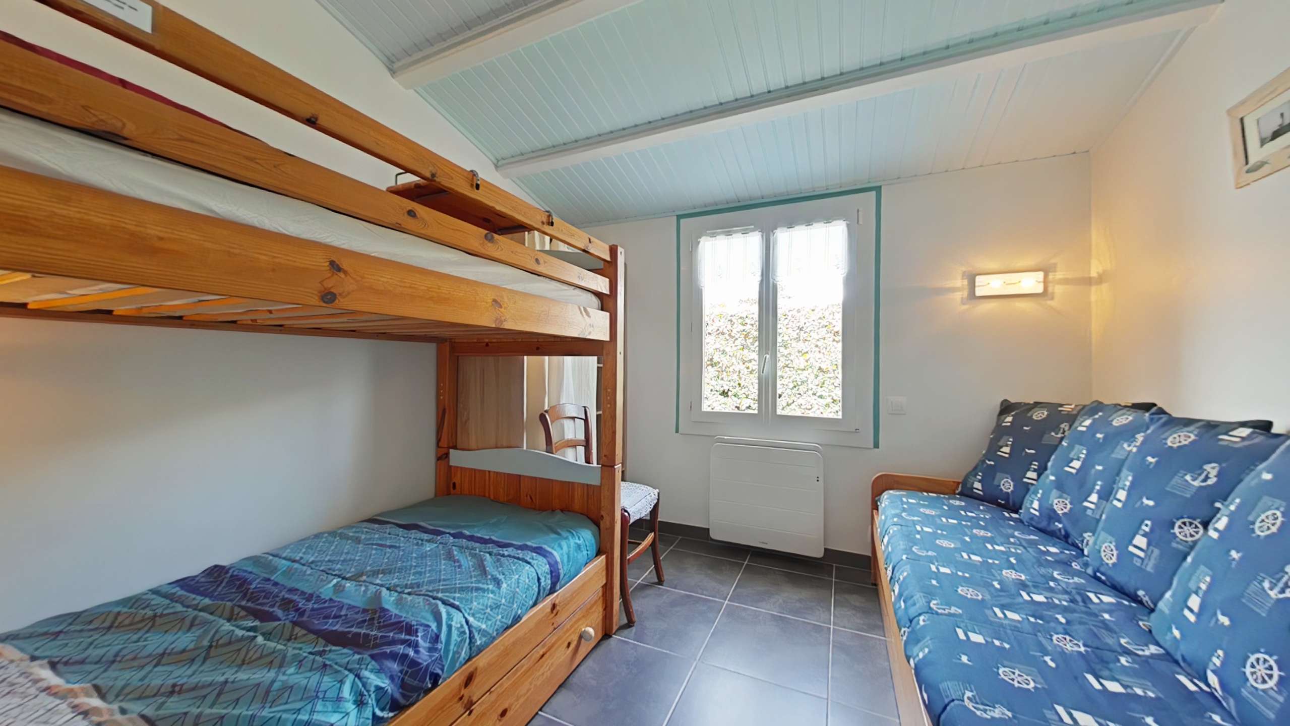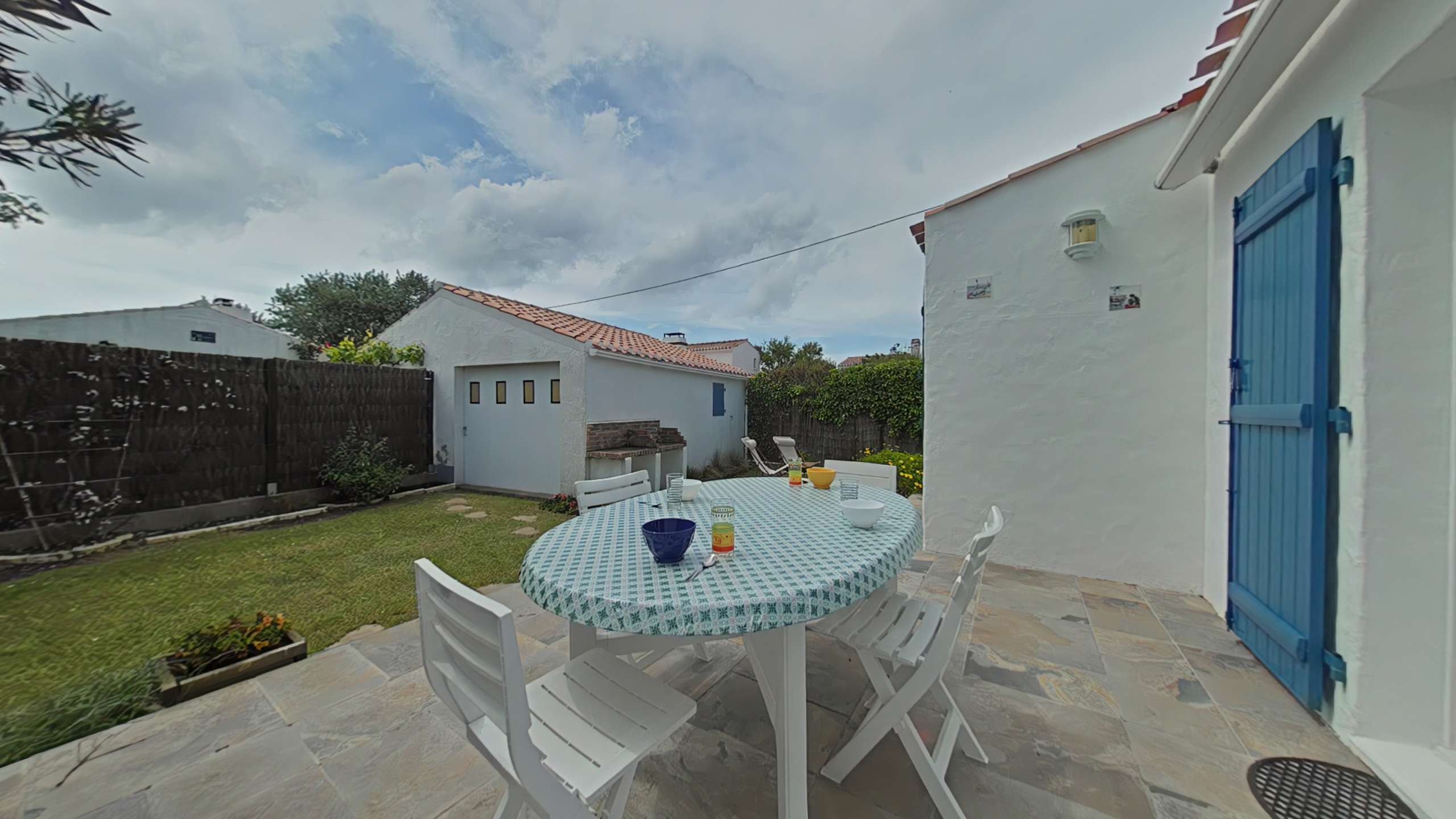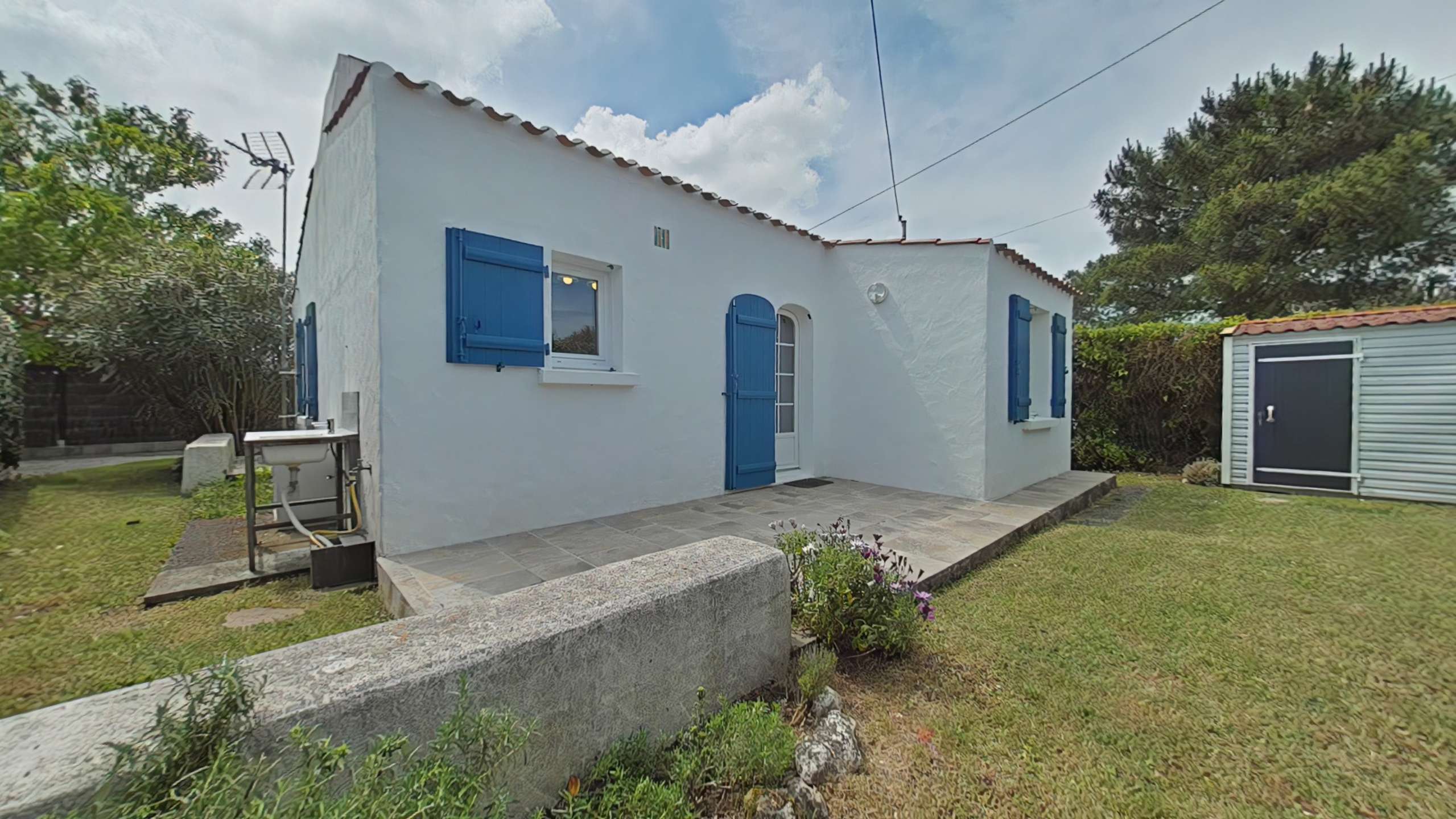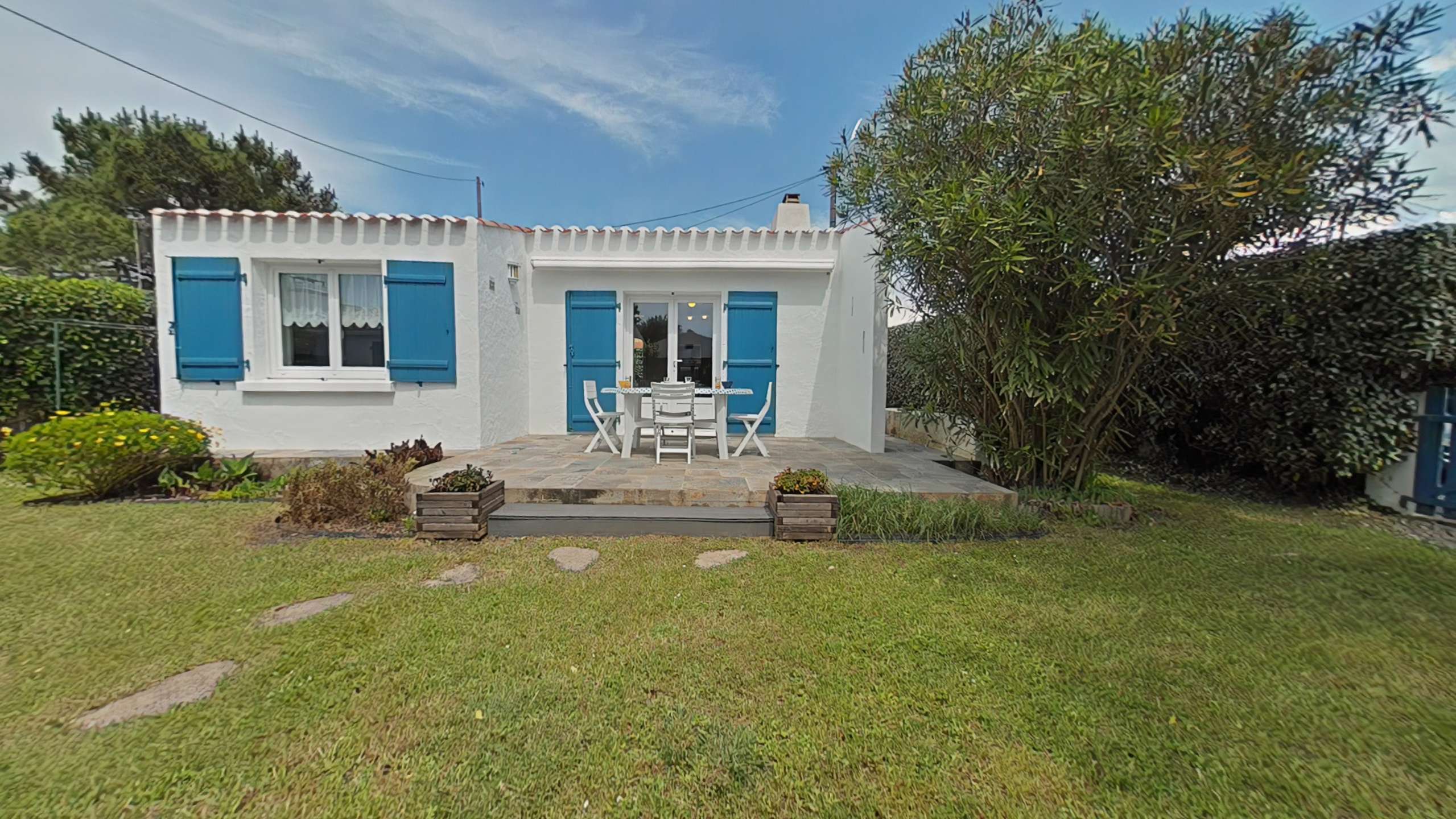Noirmoutier en l'île (85) -Quartier des Sableaux 3-room house - approx. 53 m² - up to 5 people This holiday home includes an open and equipped kitchen, a living room opening onto the terrace, a bedroom with a double bed and a television, a bedroom with two bunk beds and a single bed, a bathroom and a separate toilet. An exterior sink in the rear part. The advantages of this rental by the sea: The garden is enclosed with a terrace and has garden furniture, barbecue and deckchairs. Parking is on the property. The terrace faces south.