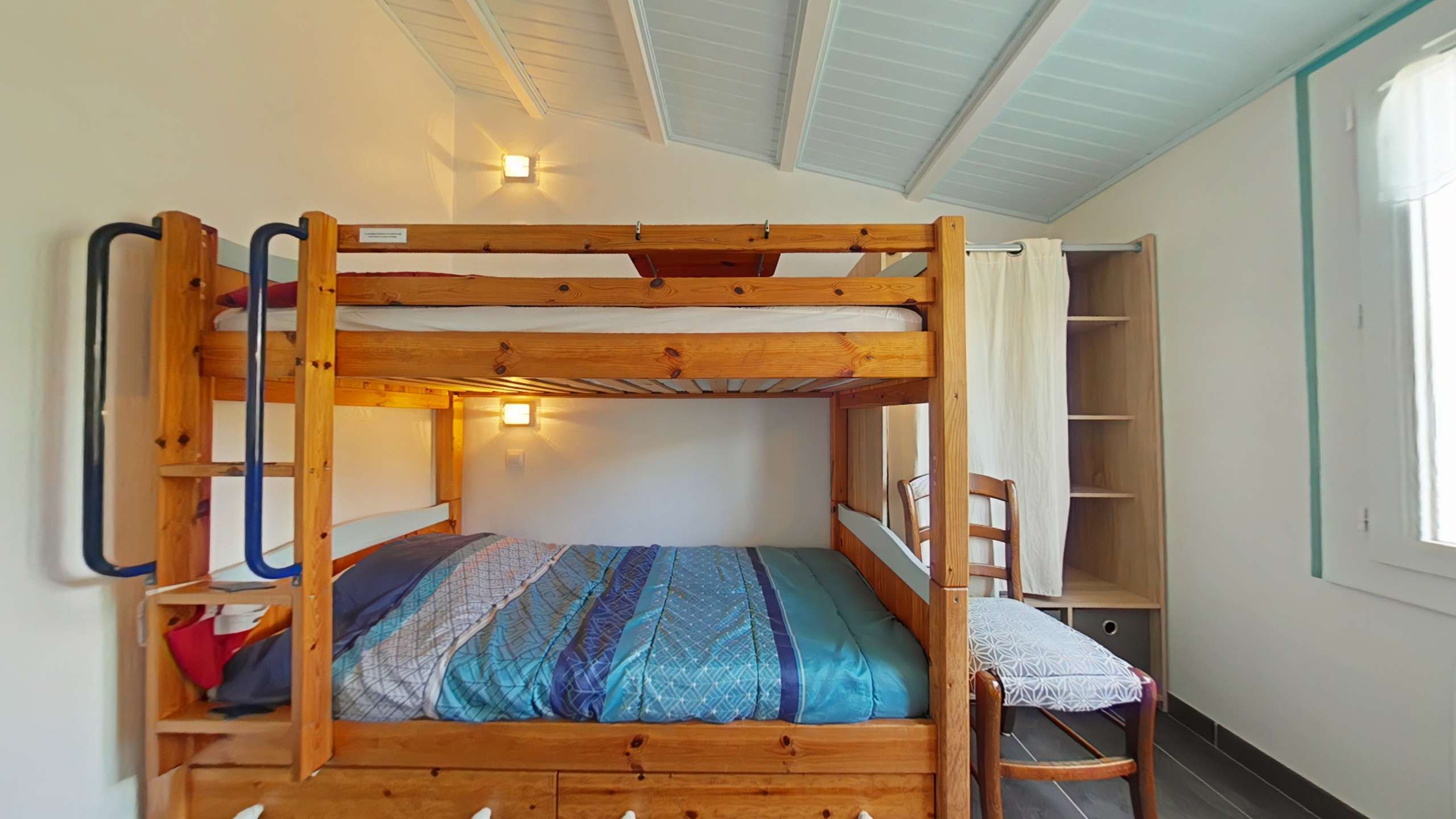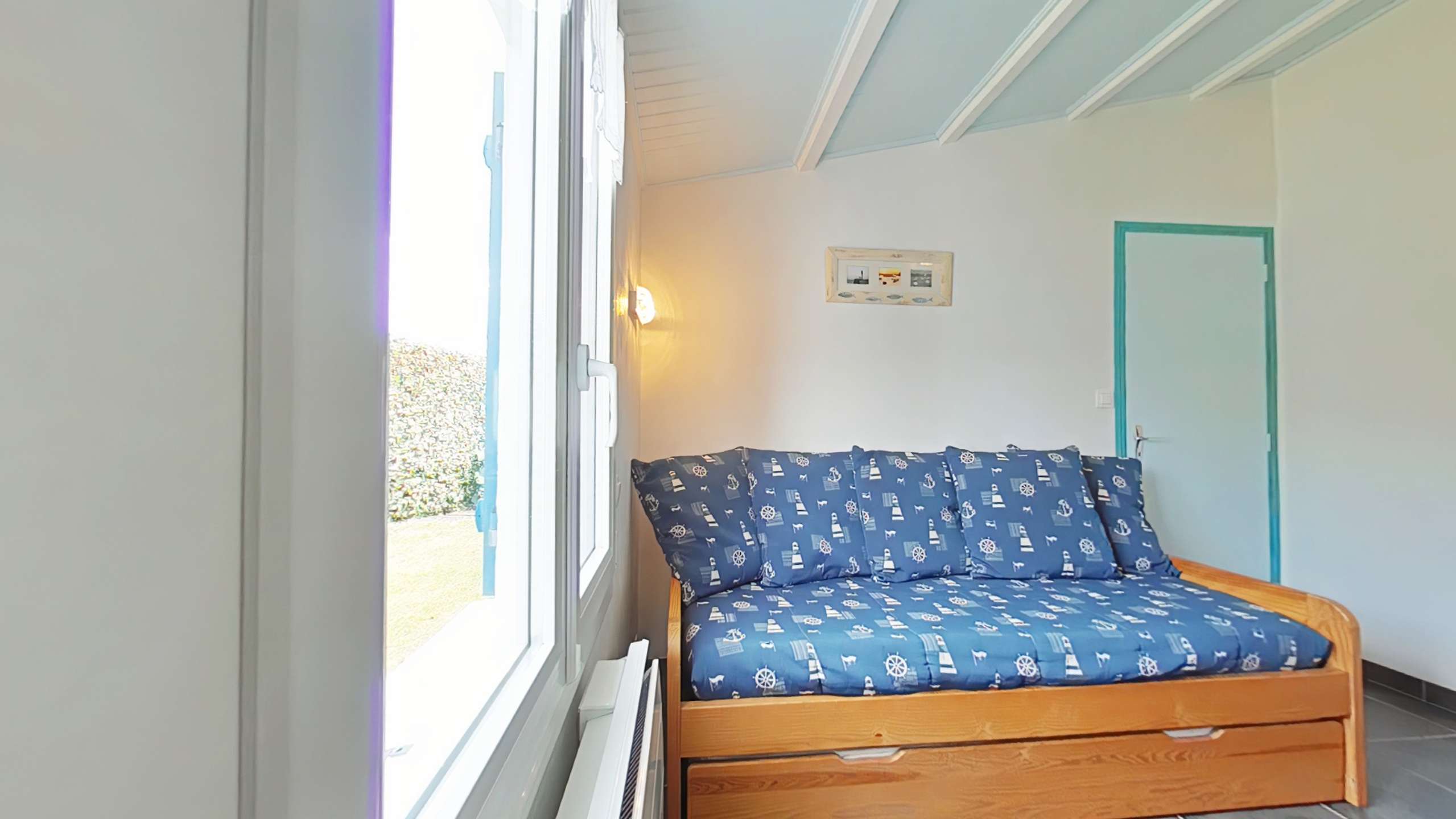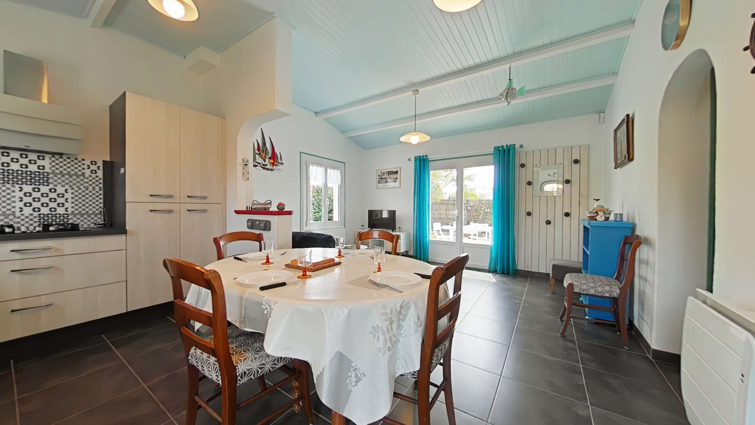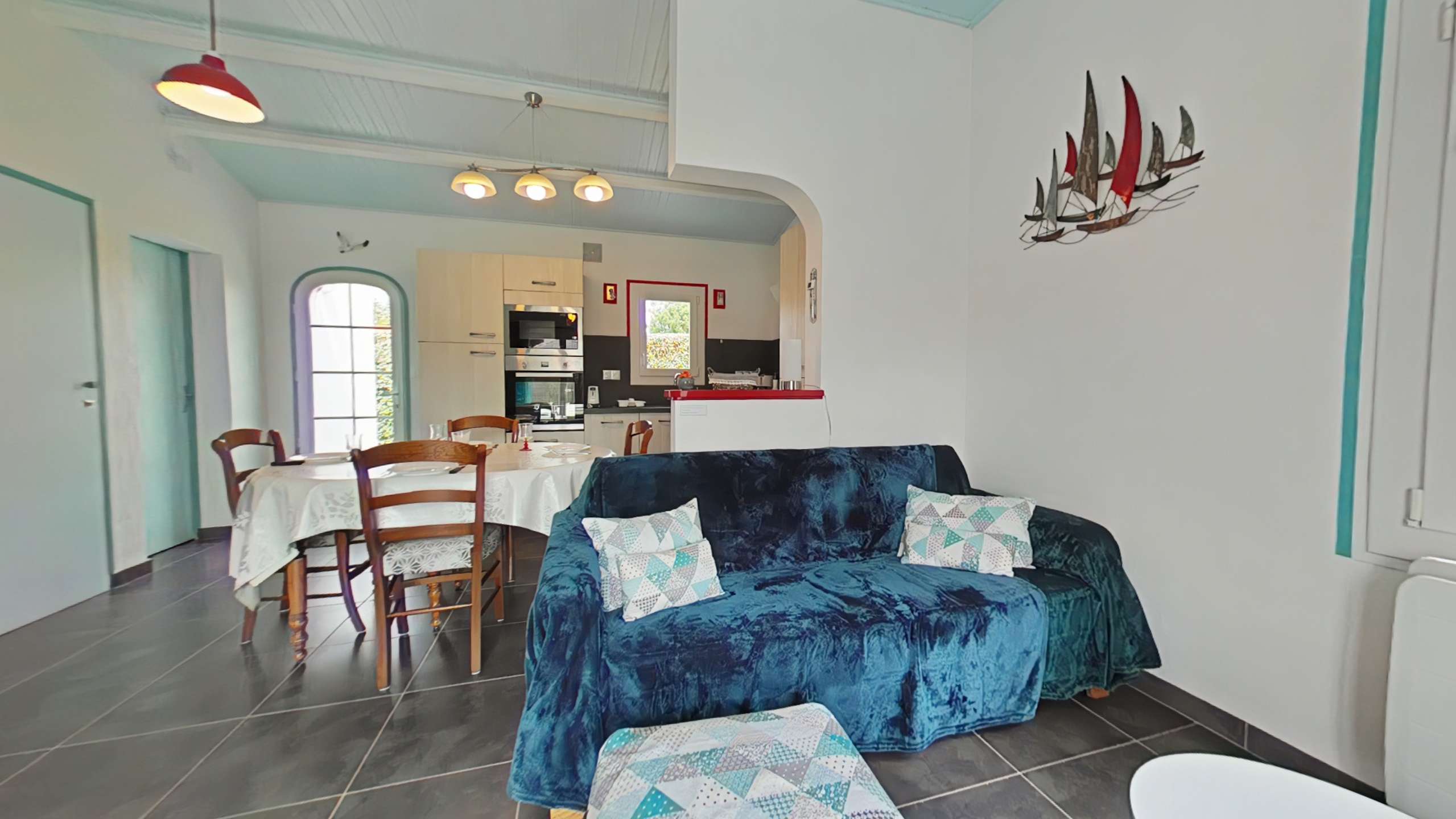 Noirmoutier en l'île (85) -Quartier des Sableaux 3-room house - approx. 53 m² - up to 5 people This holiday home includes an open and equipped kitchen, a living room opening onto the terrace, a bedroom with a double bed and a television, a bedroom with two bunk beds and a single bed, a bathroom and a separate toilet. An exterior sink in the rear part. The advantages of this rental by the sea: The garden is enclosed with a terrace and has garden furniture, barbecue and deckchairs. Parking is on the property. The terrace faces south.
